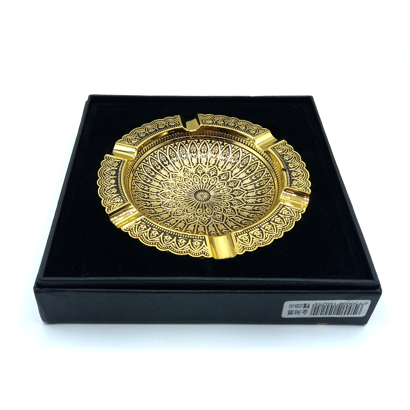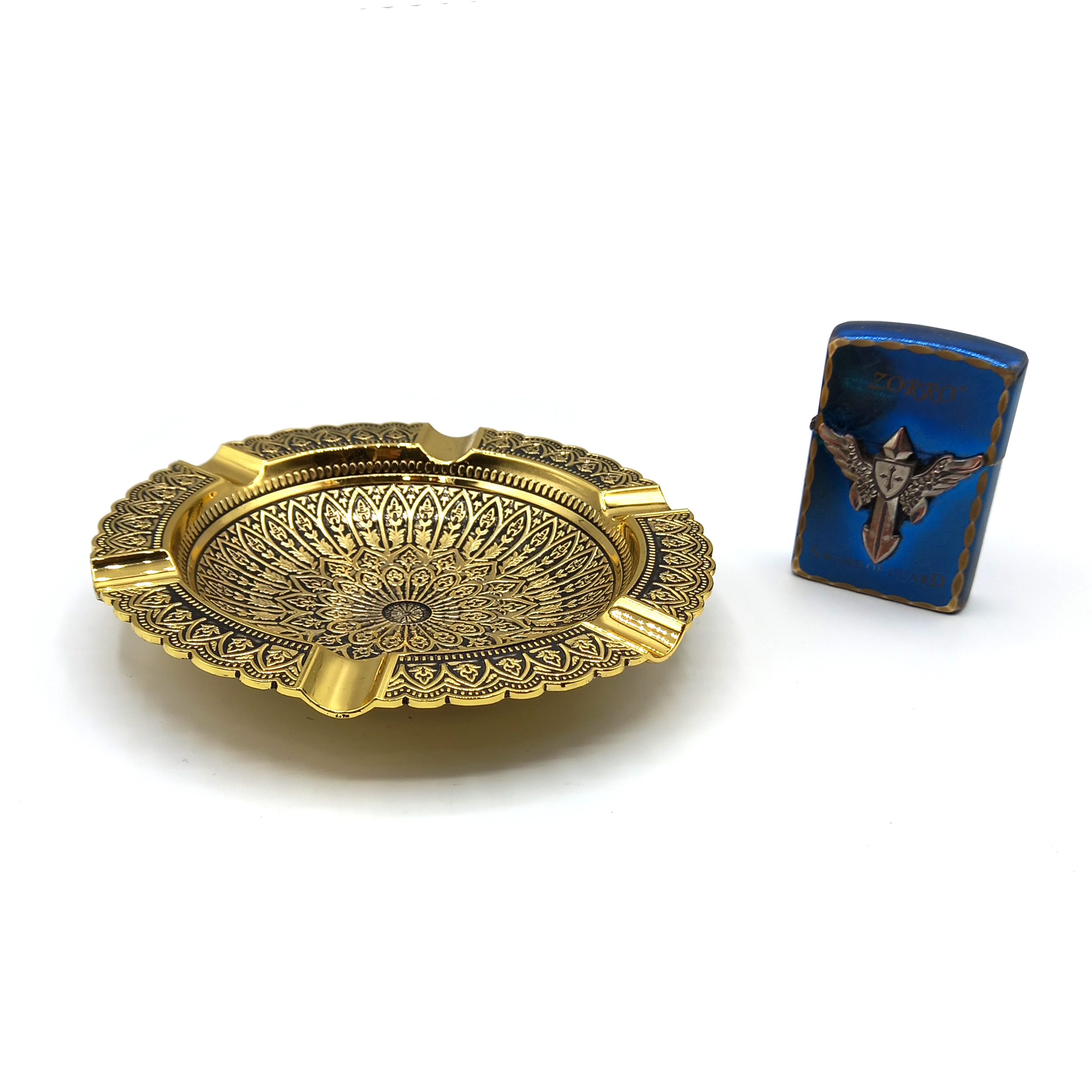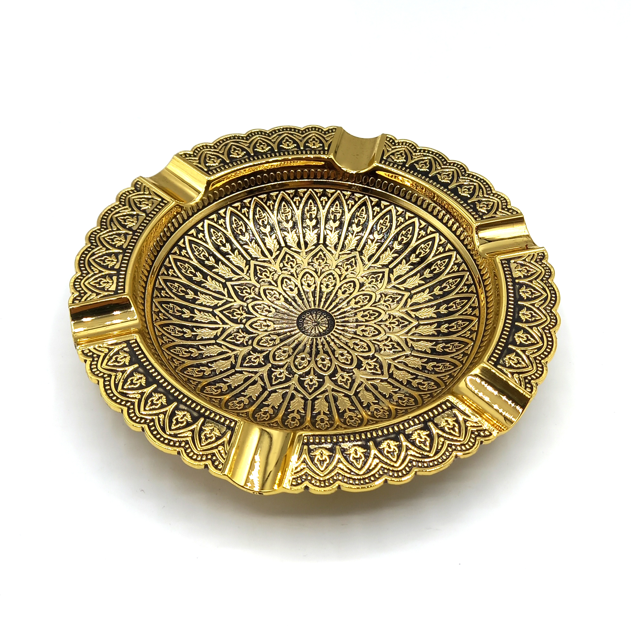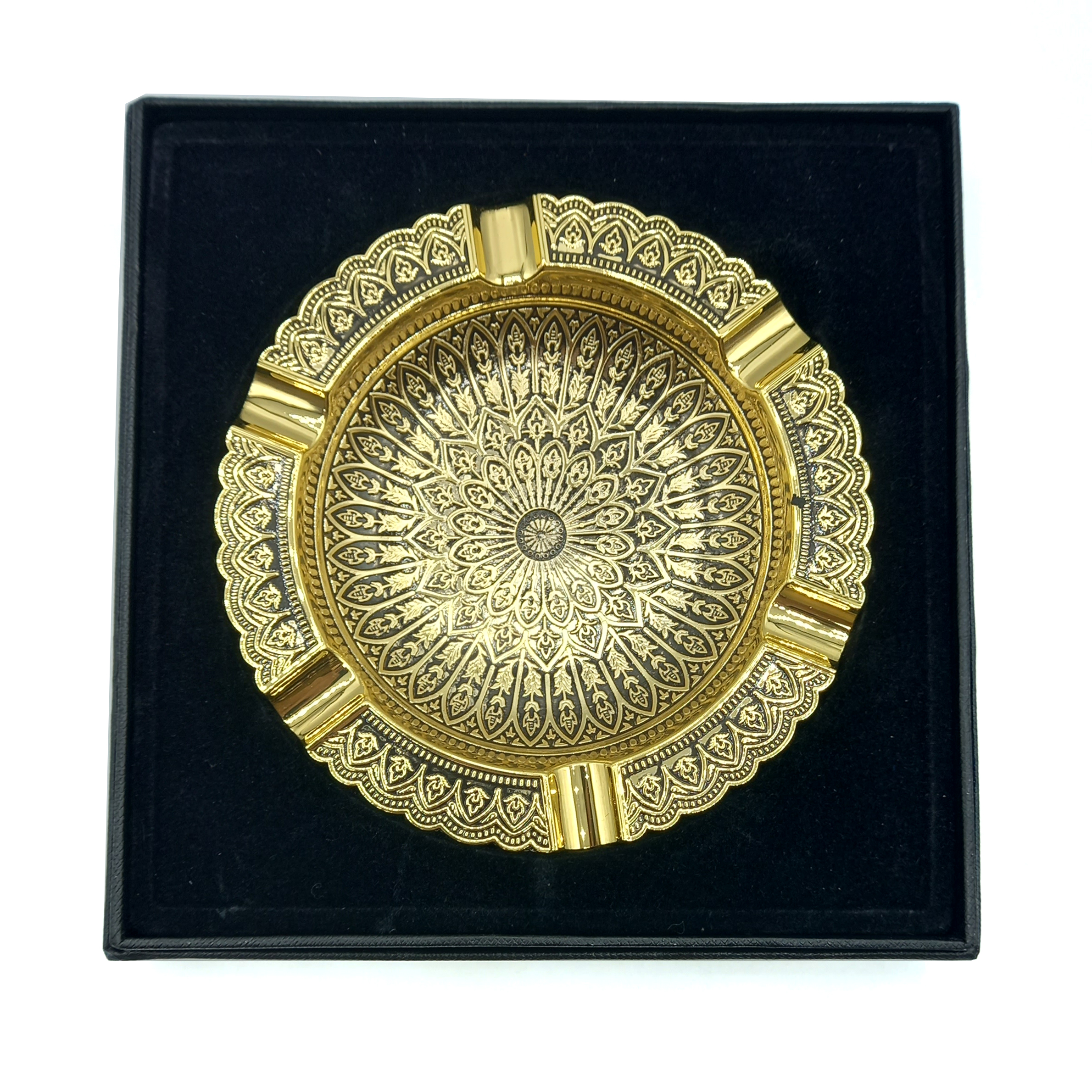 همانطور که از اسمش پیداست، این زیرسیگاری از جنس فلز با کیفیت و رنگ ثابت تولید شده است. همچنین دارای نقوش کنده کاری شده میباشد. این زیرسیگاری در نهایت با آبکاری طلایی به زیباترین حالت تزئین شده است.