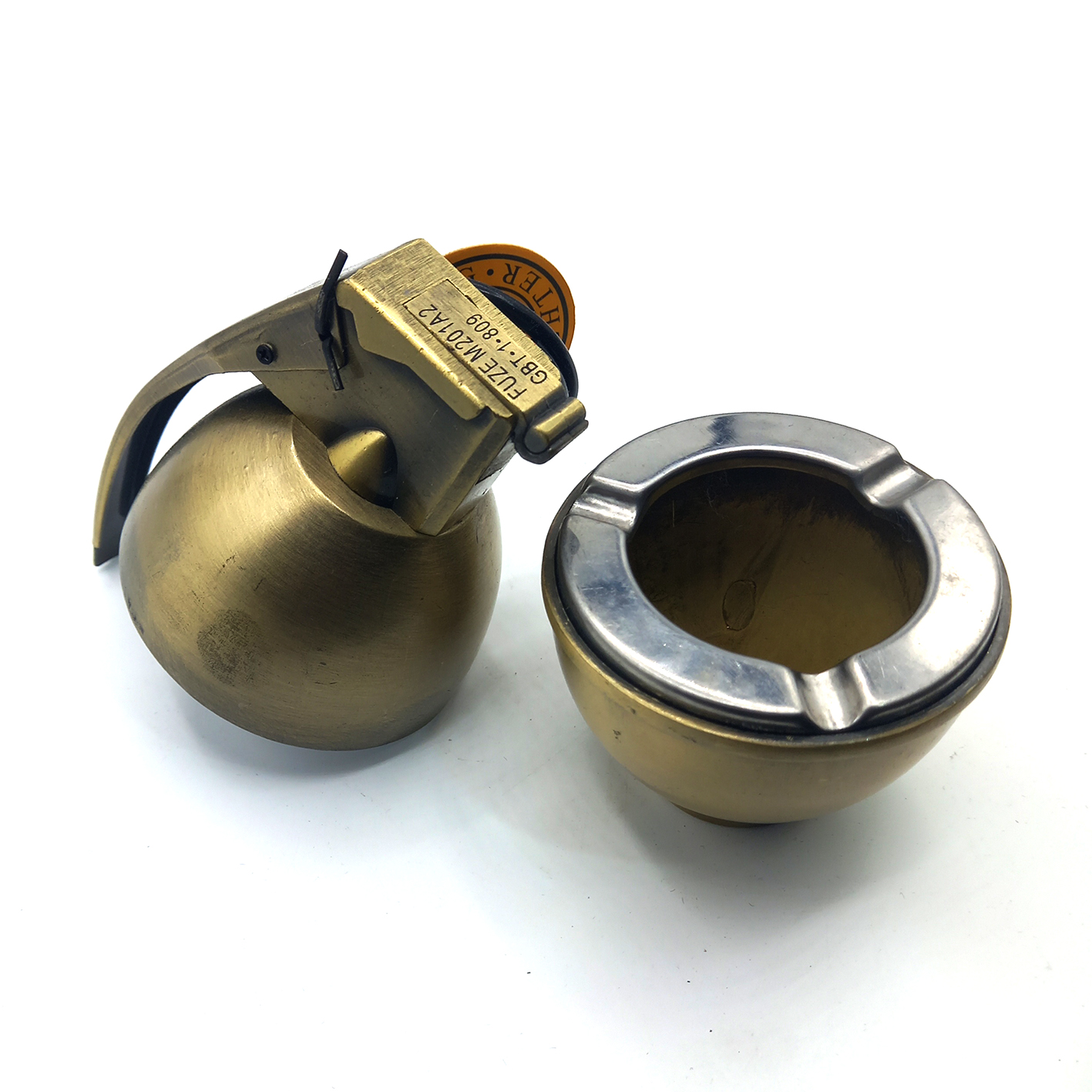ست زیر سیگاری و فندکی که در تصویر مشاهده میکنید، فرمی گرد و کاملا شبیه به یک نارنجک واقعی دارد. روی بدنه فلزی این نارنجک مشخصات یک نارنجک حک شده که ظاهر آن را بسیار جذاب کرده است.